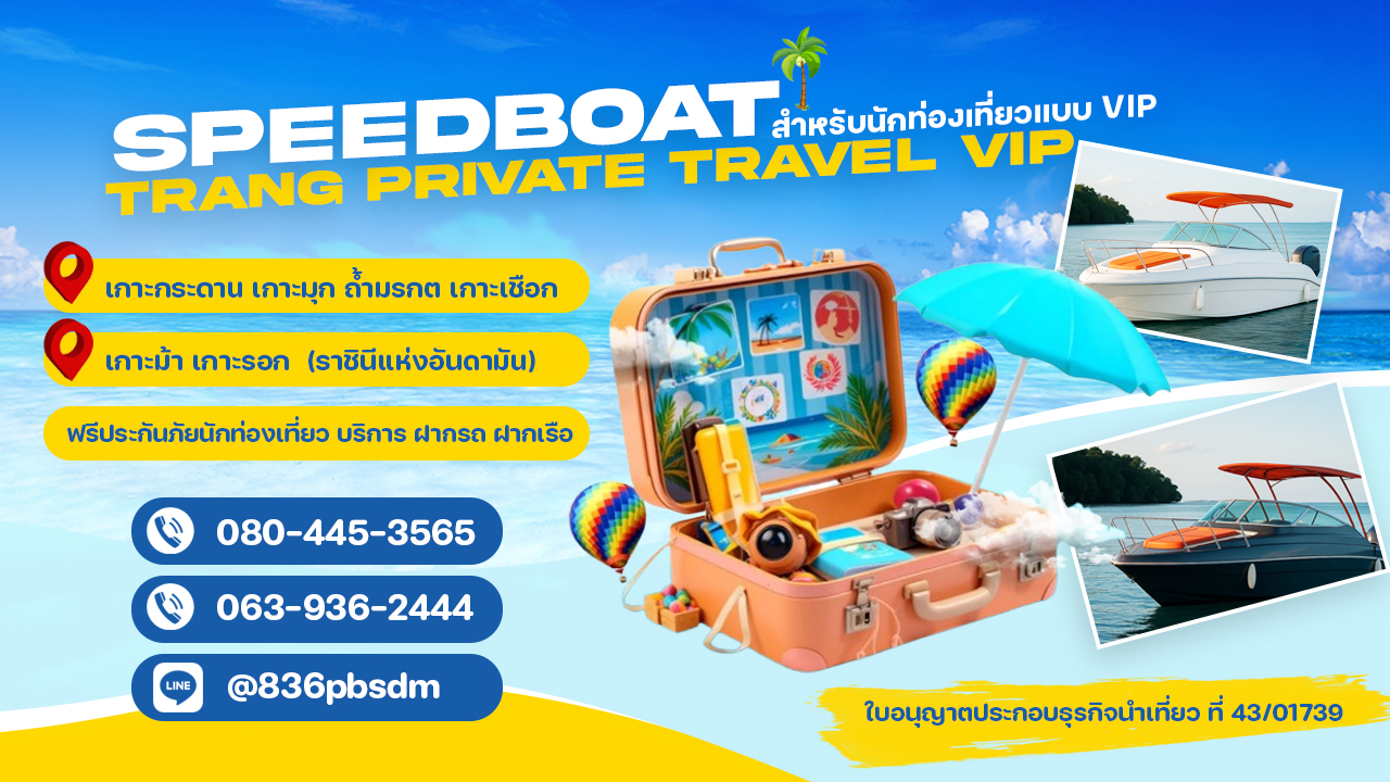 เรือสปีดโบ๊ท VIP สำหรับนักท่องเที่ยวกลุ่มเล็ก ไม่เกิน 8 ท่าน พร้อมสิ่งอำนวยความสะดวกครบครัน