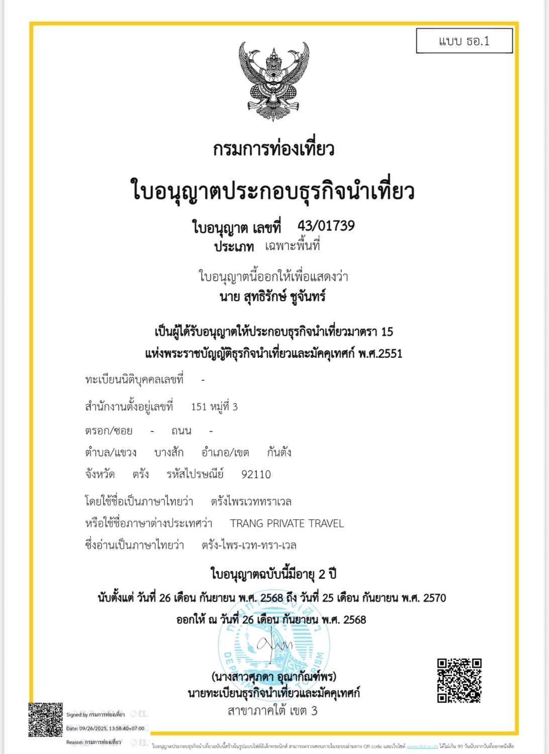 เราได้รับใบอนุญาตนำเที่ยวจากการท่องเที่ยวแห่งประเทศไทย (เลขที่ 43/01739) ลูกค้าสามารถมั่นใจได้ว่า ทุกการเดินทางกับเราจะเต็มไปด้วยรอยยิ้มและความทรงจำที่ดี